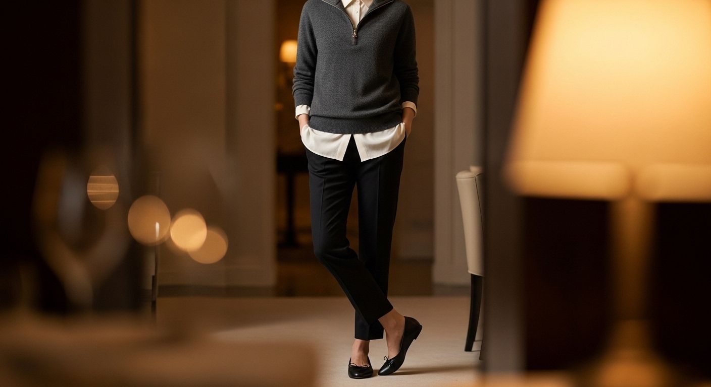 To achieve casual comfort with dignity, move away from logo-heavy hoodies. The more refined choice is a chic cashmere or merino wool half-zip pullover or zip-front cardigan. These pieces offer the same ease and warmth but with a far more luxurious sensibility. In versatile neutrals like oatmeal, camel, or charcoal, they exude a quiet luxury that is both comfortable and impeccably stylish.
